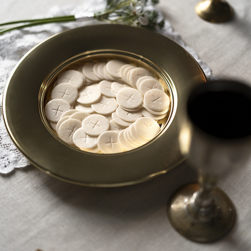 L’eucharistie est un sacrement, c’est-à-dire un signe visible de l’action de Dieu et un moyen d’en vivre. L’eucharistie est le moment de la messe où toute l’assemblée des croyants présente à Dieu du pain sans levain (l’hostie) et une coupe de vin pour qu’ils deviennent Corps et Sang de Jésus-Christ, par la prière que le prêtre adresse à Dieu. Les fidèles viennent ensuite manger et boire le Corps et le Sang du Christ.